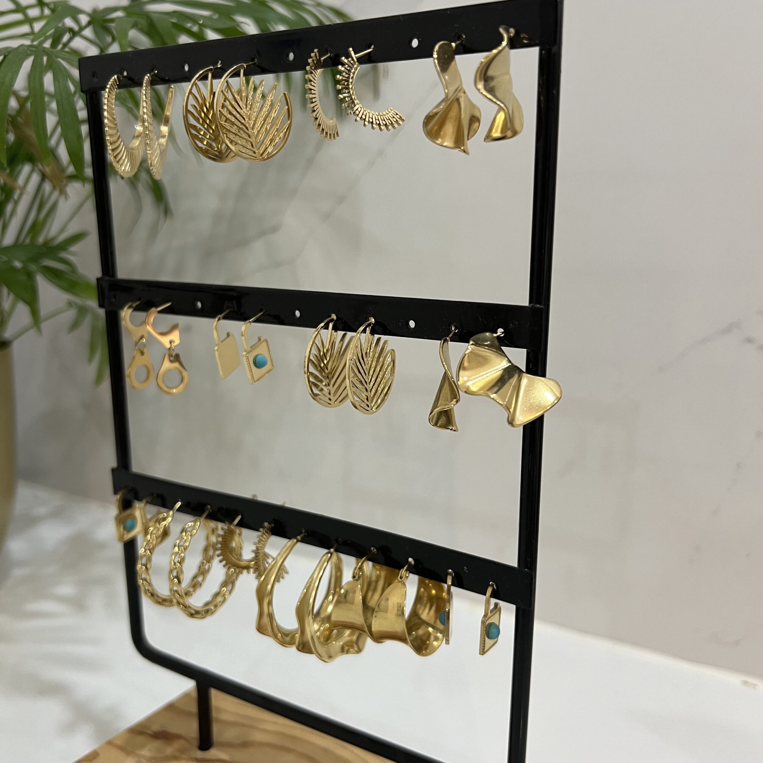 Cette plaque expose une collection raffinée de boucles d’oreilles en acier inoxydable. Chaque paire, minutieusement pensée, apporte une touche sophistiquée à votre style.