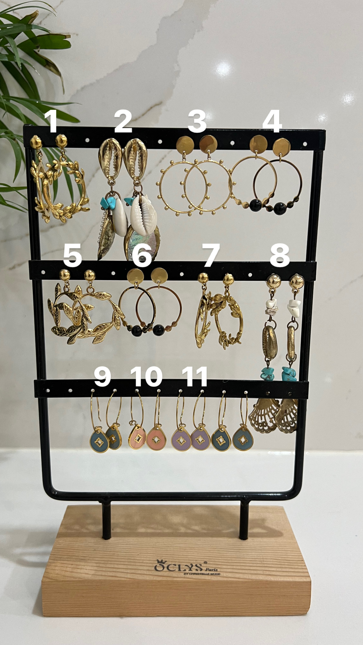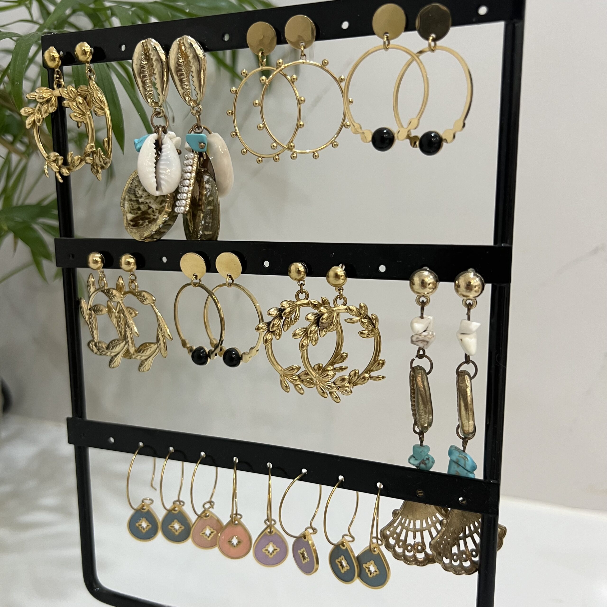 Cette plaque présente une séduisante collection de boucles d’oreilles, chacune soigneusement conçue. Les boucles, fabriquées en acier inoxydable, allient l’élégance classique à une diversité de designs. Chaque paire de boucles d’oreilles, avec ses formes distinctes et son éclat sophistiqué, ajoute une touche de raffinement à toute tenue.