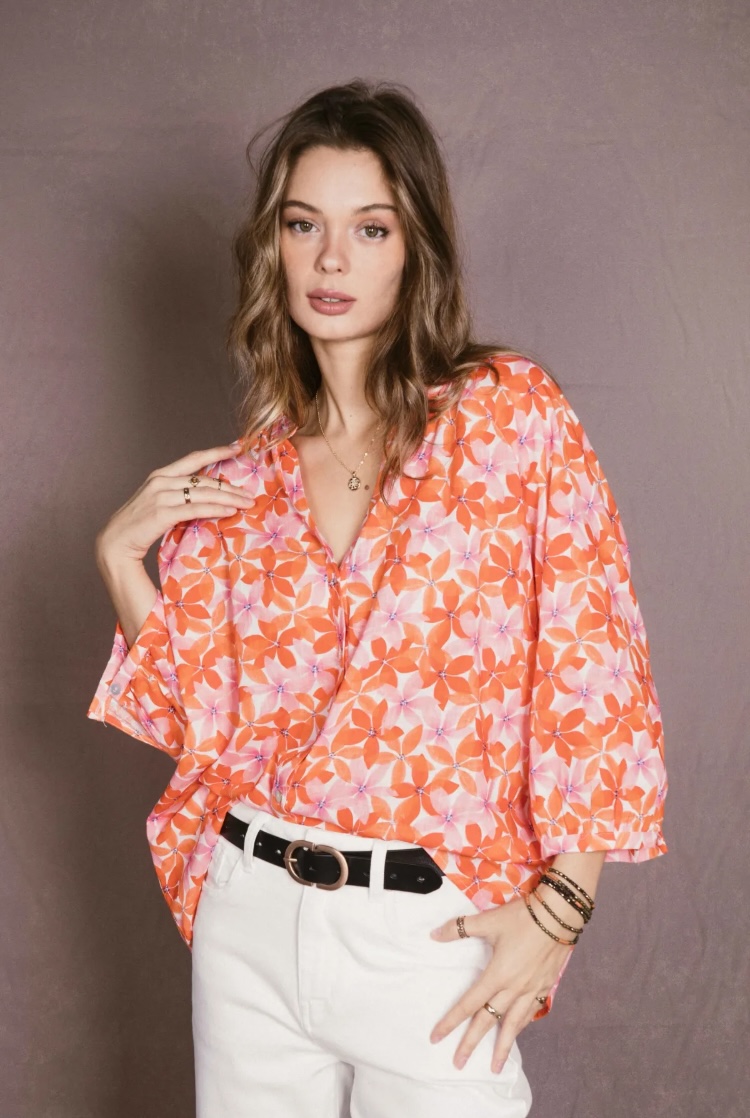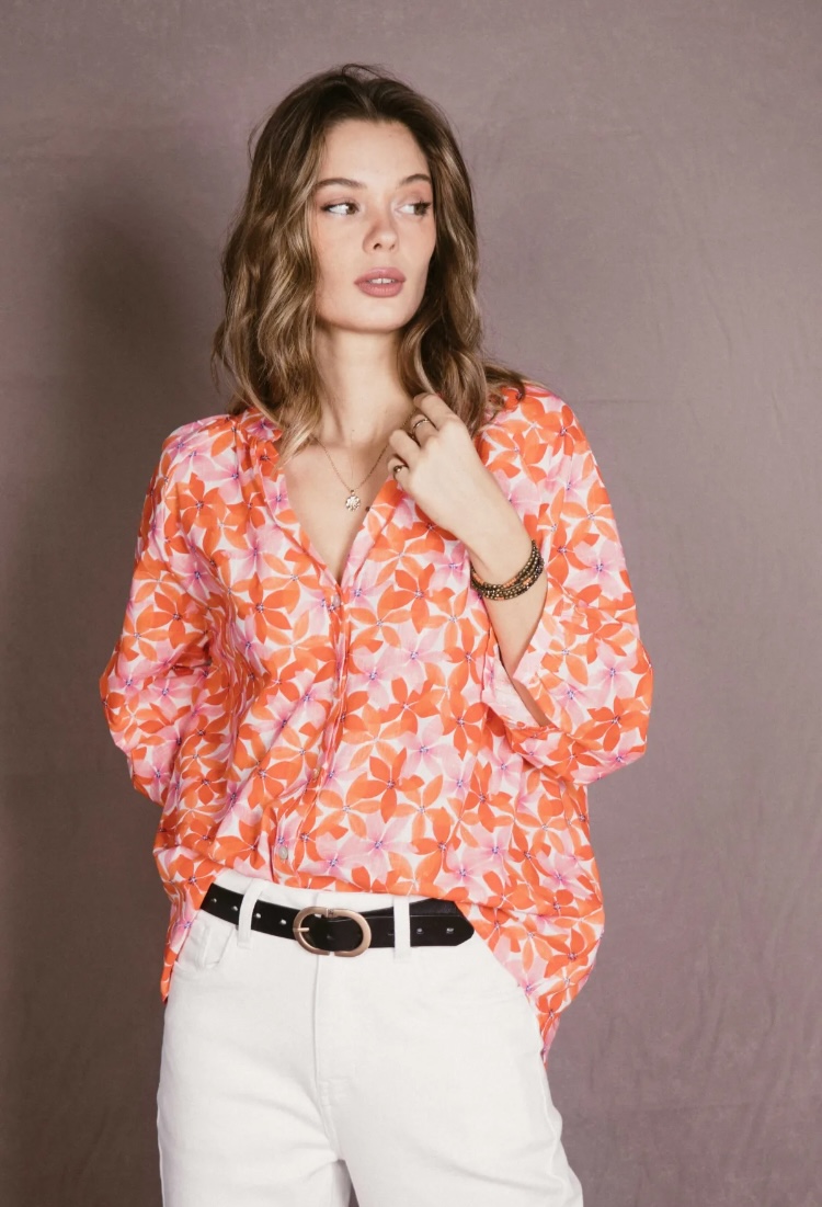 La chemise taille unique au motif floral rose et orange est un mélange harmonieux de couleurs vives et de motifs élégants. Fabriquée pour convenir à toutes les tailles, elle offre un ajustement confortable et décontracté. Les fleurs roses et oranges égayent le tissu, ajoutant une touche de fraîcheur et de vitalité à cette pièce. Cette chemise est parfaite pour une tenue décontractée chic, apportant une touche de couleur et de style à n’importe quelle journée.